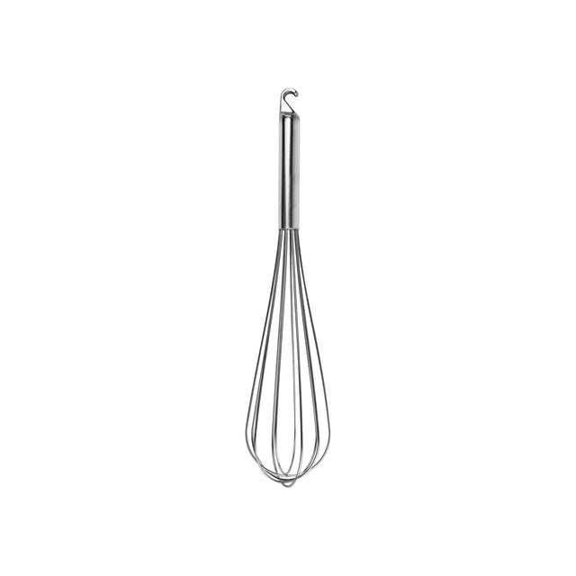 Slagtålig ballongvisp i rostfritt 18/10-stål, framtagen för frekvent användning i professionella kök. Det täta och hårda stålet gör vispen både hållbar och lätt att rengöra. Med sin längd på 27 cm är den välbalanserad för effektiv vispning av grädde, såser eller smet. Utrustad med en praktisk krok i toppen för enkel upphängning och förvaring.