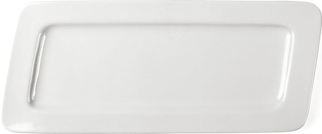 Vackert serveringsfat i modern och avlång form, perfekt för eleganta uppläggningar. Fatet passar utmärkt för rätter som landgångar, räksmörgåsar eller andra förrätter där presentationen spelar stor roll. Tillverkat av förstärkt benporslin med extra hög tålighet, vilket gör det idealiskt för daglig användning i professionella miljöer.