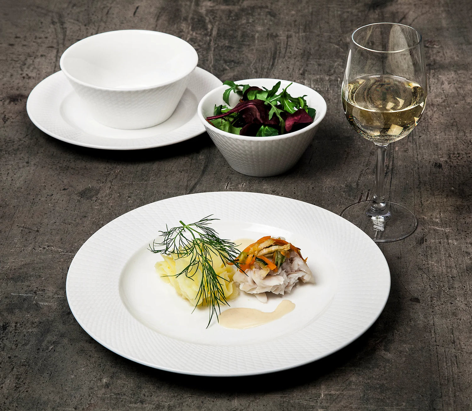 Tillverkad i förstärkt benporslin med hög kantstötningsresistens, vilket gör den idealisk för daglig användning i professionella miljöer. Serien innehåller flera storlekar och produkter för en komplett och enhetlig servis.