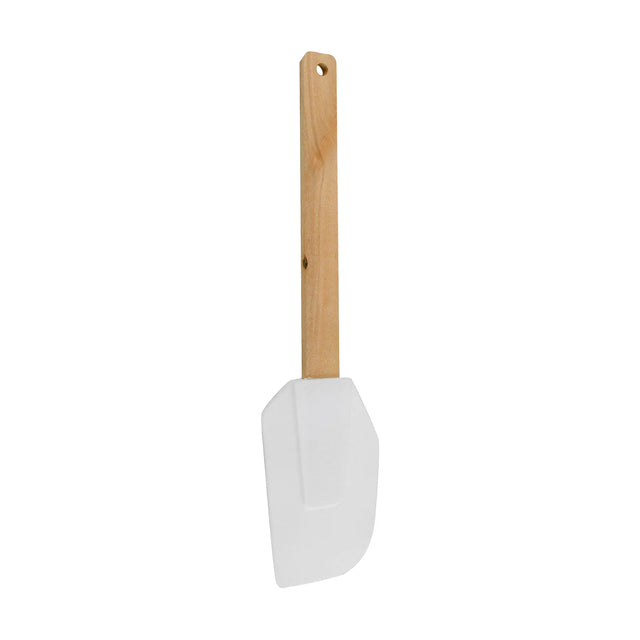 Hållbar slickepott med ett naturfärgat träskaft och en flexibel topp i vit silikon. Med en längd på 31 cm passar den utmärkt för både matlagning och bakning. Silikondelen tål temperaturer från -50 °C till +230 °C, vilket gör den idealisk för såväl kalla som varma moment. Skaftet har ett praktiskt hål för enkel upphängning och förvaring.